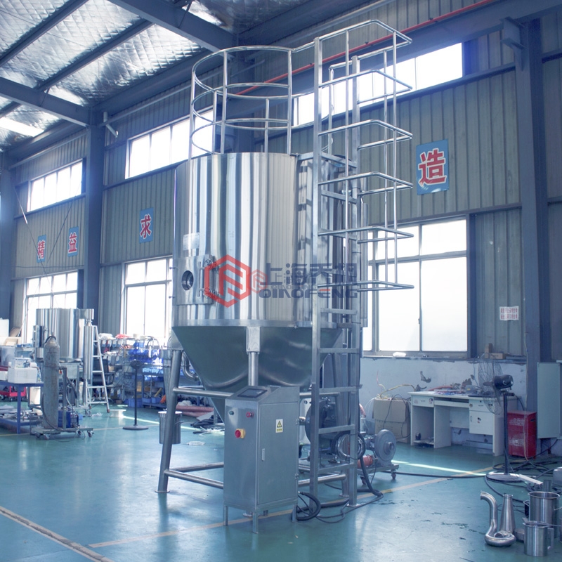 空气经过滤和加热,进入干燥器顶部空气分配器,热空气呈螺旋状均匀地进入干燥室。料液经塔体顶部的高速离心雾化器,(旋转)喷雾成极细微的雾状液珠,与热空气并流接触在极短的时间内可干燥为成品。成品连续地由干燥塔底部和旋风分离器中输出,废气由引风机排空 。