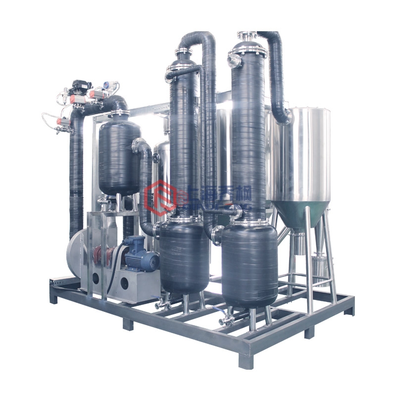 冷凝系统由制冷机组、冷凝器、冷媒循环泵、过滤器、换热器及连接管路组成。从除尘器排出的“湿”气体(包含被蒸发的有机溶剂蒸汽)进入冷凝器,气体经冷凝器冷却除液后返回气体循环系统,有机溶剂蒸汽经冷凝回收后通过冷凝器底部的液位控制器自动排入溶剂罐内。