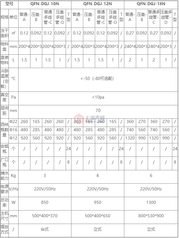QFN系列冷冻干燥机包括:实验室经济型N系列真空冷冻干燥机(QFN-DGJ-N系列)、经济型FE系列电加热中试真空冷冻干燥机(QFN-DGJ-FE系列)、 F系列硅油加热生产型真空冷冻干燥机(QFN-DGJ-F系列)、小型生产/中试生产/冻干面积大于3平方以上生产型(QFN-DGJ-GLZ系列)、食品级真空冷冻干燥机(QFN-DGJ-FD系列)等5大类,共计几十个机型能满足不同用户的需求。