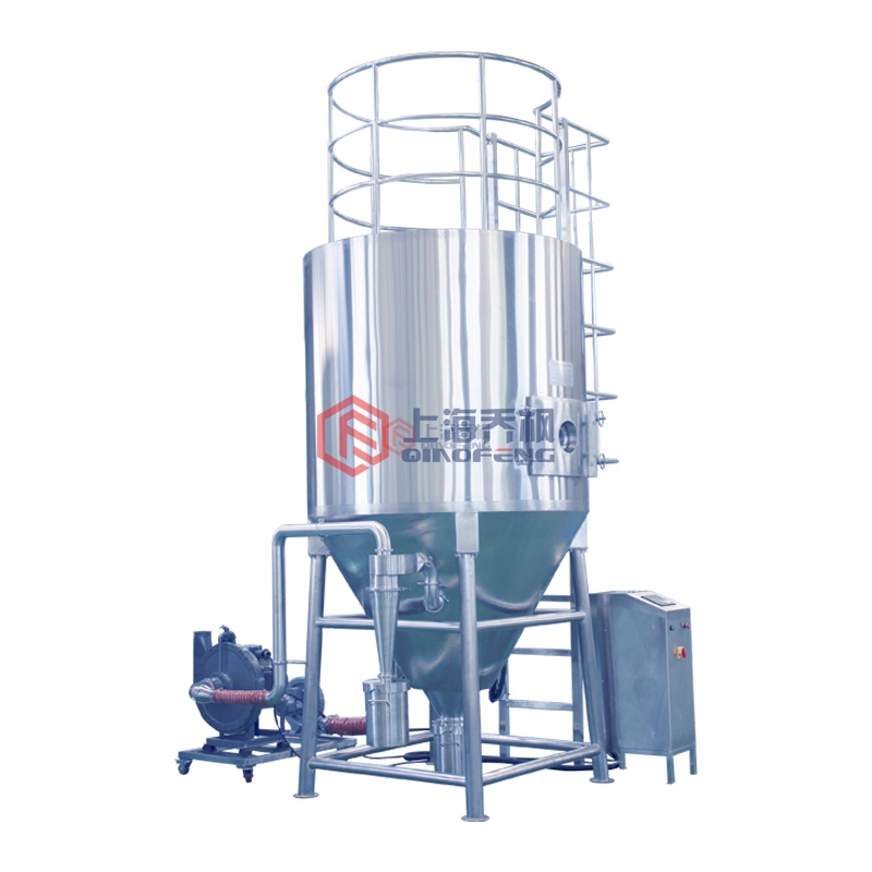 空气经过滤和加热,进入干燥器顶部空气分配器,热空气呈螺旋状均匀地进入干燥室。料液经塔体顶部的高速离心雾化器,(旋转)喷雾成极细微的雾状液珠,与热空气并流接触在极短的时间内可干燥为成品。成品连续地由干燥塔底部和旋风分离器中输出,废气由引风机排空 。
